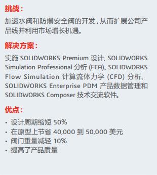 Penn-Troy Manufacturing 利用 SOLIDWORKS設(shè)計(jì)、仿真、 CFD 分析、 PDM 和技術(shù)交流解決方案來縮短設(shè)計(jì)周期、提高質(zhì)量、減少原型并擴(kuò)展其專業(yè)水和防爆安全閥系列。