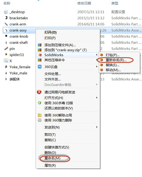 下方的重命名為Windows自帶文件重命名,更改文件名時(shí)并未變更裝配體所引用位置。當(dāng)需要文件重命名時(shí)采用上方的:SOLIDWORKS—重命名 如下圖