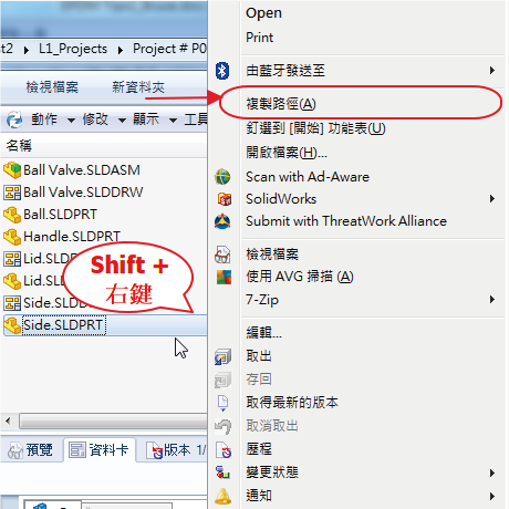 在庫內(nèi)檔案上按住Shift鍵并點擊鼠標(biāo)右鍵,在彈出的指令列出,就會多一項”復(fù)制路徑”的指令,使用此指令就可以直接復(fù)制檔案的完整路徑加上文件名并且會包含在雙引號中。如下列所示: